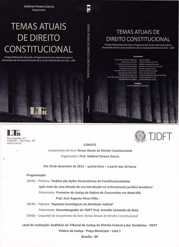 Acontece, no próximo dia 10, o lançamento da obra "Temas Atuais de Direito Constitucional", organizada por Valdinei Pereira Garcia, com a coautoria de Tatiana Fiore d'Almeida, diretora do IAPE - Instituto dos Advogados Previdenciários - Conselho Federal. O evento será em Brasília, no TJ/DF, a partir das 18h. (Clique aqui)