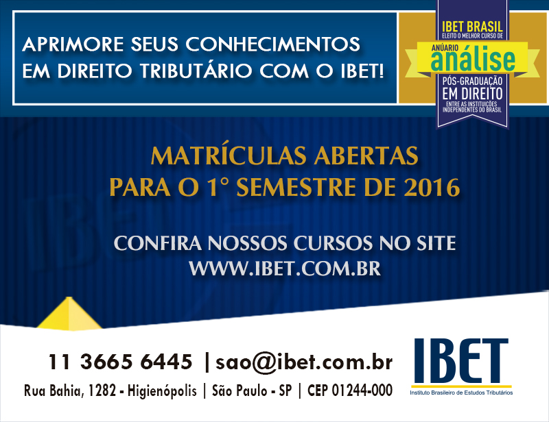 O Instituto Brasileiro de Estudos Tributários - IBET está com matrículas abertas para o 1º semestre de 2016 para aprimorar os conhecimentos em Direito Tributário (clique aqui). Confira a relação de cursos. (Clique aqui)