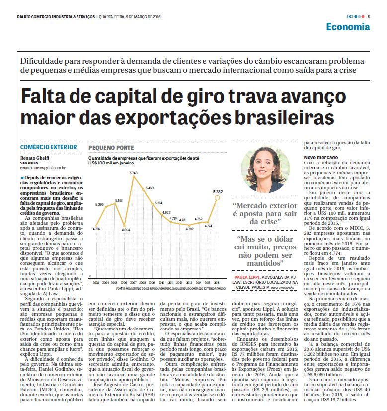 Sobre a dificuldade das empresas em conseguir capital de giro para avançar com exportações e fugir da crise no país, a advogada Paula Lippi, do escritório AJ Law Advogados, falou ao jornal DCI. "Muitas empresas têm toda a capacidade para exportar, mas não conseguem manter o preço das vendas se o dólar cai muito, ficando sem dinheiro para segurar o negócio." (Clique aqui)