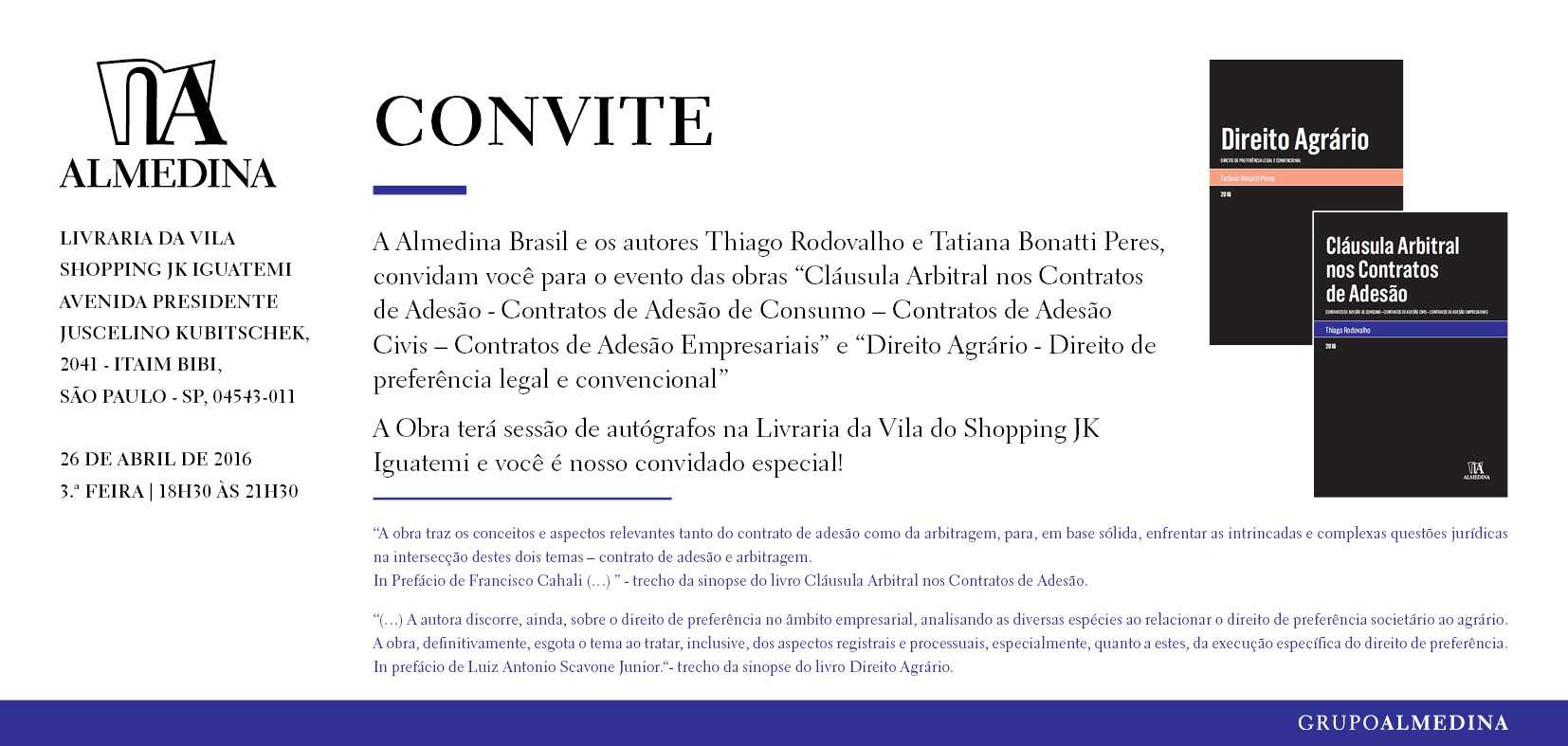 Os autores Thiago Rodovalho e Tatiana Bonatti Peres lançam, amanhã, os livros "Cláusula Arbitral nos Contratos de Adesão" e "Direito Agrário". O evento será em SP, na Livraria da Vila do Shopping JK Iguatemi, das 18h30 às 21h30. (Clique aqui)