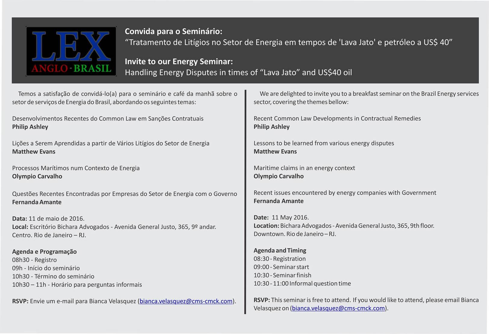 No dia 11/5, no RJ, Fernanda Amante, do escritório Bichara Advogados, palestra no seminário "Tratamento de Litígios no Setor de Energia em tempos de 'Lava Jato' e petróleo a US$ 40". (Clique aqui)