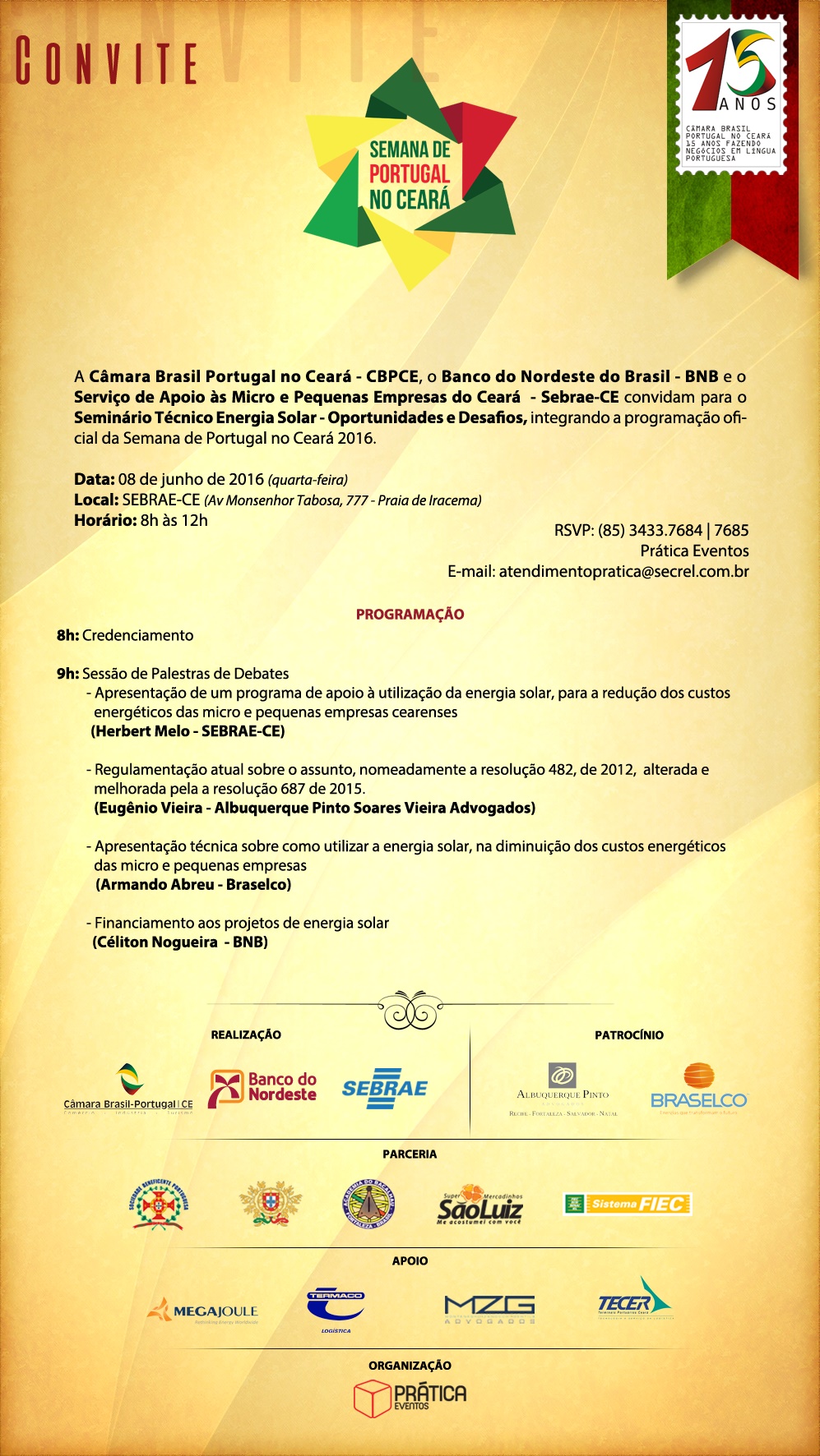 Durante o seminário "Técnico Energia Solar - Oportunidades e Desafios", que acontece dia 8/6, Eugênio Vieira, do escritório Albuquerque Pinto Advogados, fala sobre "Regulamentação atual sobre o assunto, nomeadamente a resolução 482, de 2012, alterada e melhorada pela a resolução 687 de 2015". (Clique aqui)