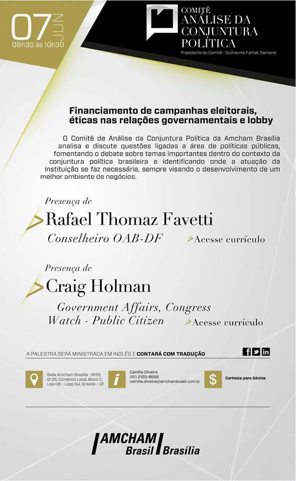 Hoje, Rafael Thomaz Favetti, da banca Favetti Sociedade de Advogados, participa de debate no Comitê de Análise da Conjuntura Política sobre o Financiamento de Campanhas Eleitorais, Éticas nas Relações Governamentais e Lobby. (Clique aqui)