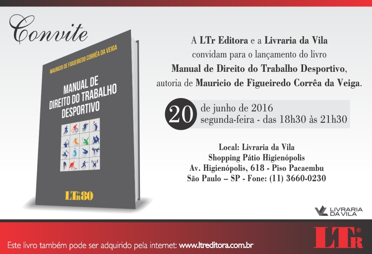 Acontece, no próximo dia 20, o lançamento do livro "Manual de Direito do Trabalho Desportivo", de Mauricio de Figueiredo Corrêa da Veiga. O evento será em SP, na Livraria da Vila do Shopping Pátio Higienópolis, das 18h30 às 21h30. (Clique aqui)