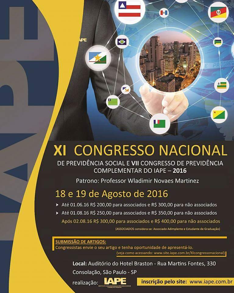 O IAPE - Instituto dos Advogados Previdenciários - Conselho Federal realiza, dias 18 e 19/8, o "XI Congresso Nacional de Previdência Social e VII Congresso de Previdência Complementar", em SP, onde será possível a entrega de artigos científicos para apresentação no evento. (Clique aqui)