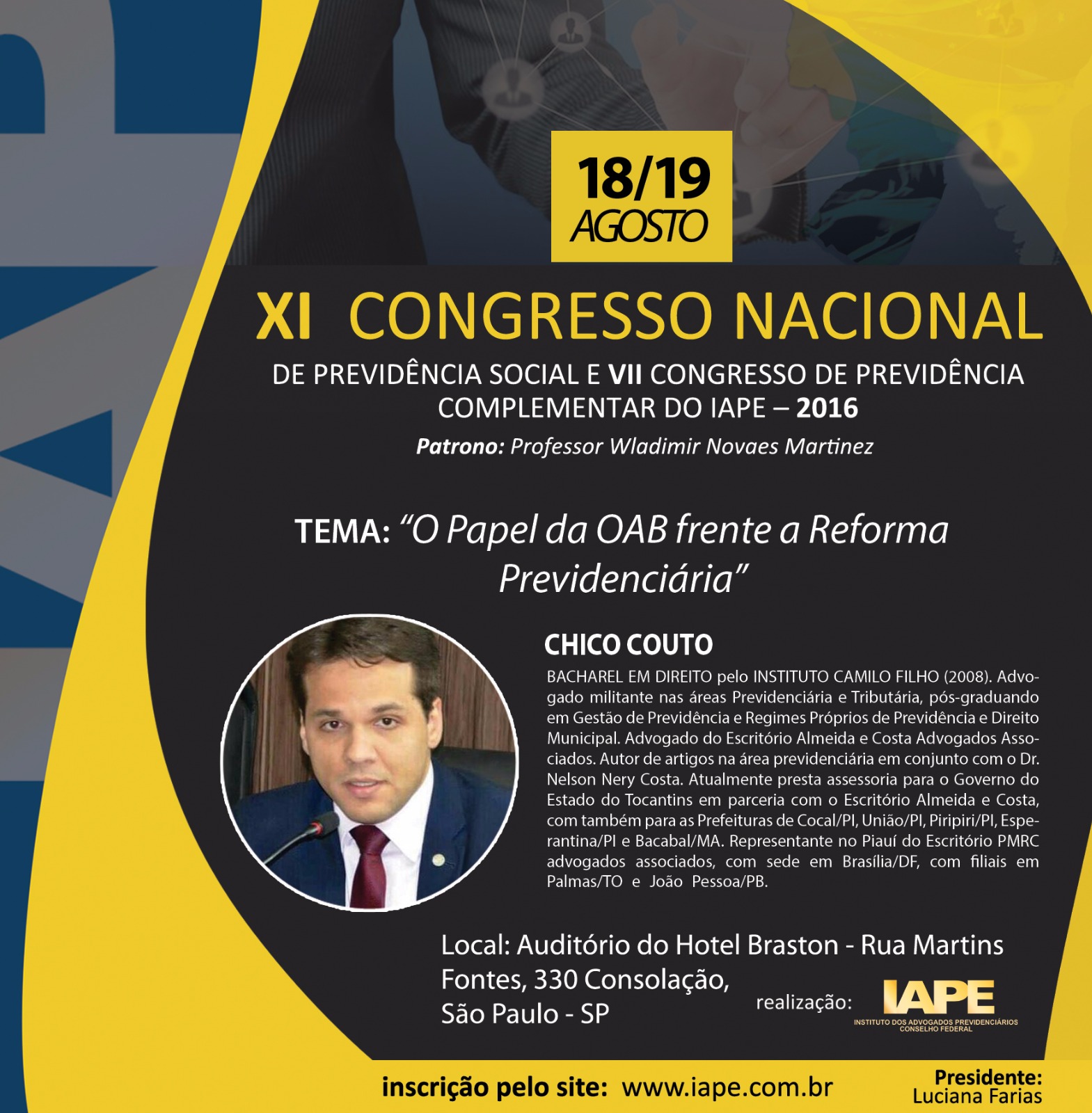 O IAPE - Instituto dos Advogados Previdenciários - Conselho Federal realizará em SP, dias 18 e 19/8, o "XI Congresso Nacional de Direito Previdenciário" e terá entre os expositores Chico Couto, presidente da Comissão de Direito Previdenciário do Conselho Federal da OAB (clique aqui). Informações e inscrições pelo site. (Clique aqui)