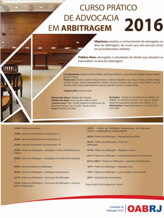 Estão abertas as inscrições para o "Curso Prático de Advocacia em Arbitragem", da OAB/RJ. Joaquim de Paiva Muniz, do escritório Trench, Rossi e Watanabe Advogados, é um dos coordenadores. A palestra de abertura será dia 13/9. Confira a programação. (Clique aqui)