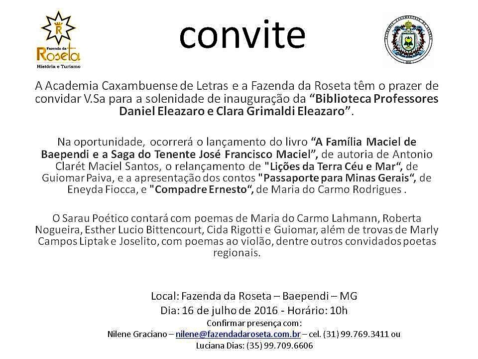 Acontece, no próximo dia 16, o lançamento do livro "A Família Maciel de Baependi e a Saga do Tenente José Francisco Maciel", de Antonio Clarét Maciel Santos ; o relançamento de "Lições da Terra Céu e Mar", de Guiomar Paiva ; e a apresentação dos contos "Passaporte para Minas Gerais", de Eneyda Fiocca, e "Compadre Ernesto", de Maria do Carmo Rodrigues. O evento será em Baependi/MG, na Fazenda da Roseta, às 10h. (Clique aqui)