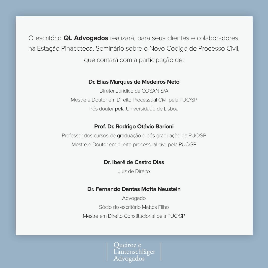 O escritório Queiroz e Lautenschläger Advogados realizará, em breve, para seus clientes e colaboradores, na Estação Pinacoteca, seminário sobre o novo CPC, que contará com participações importantes. (Clique aqui)