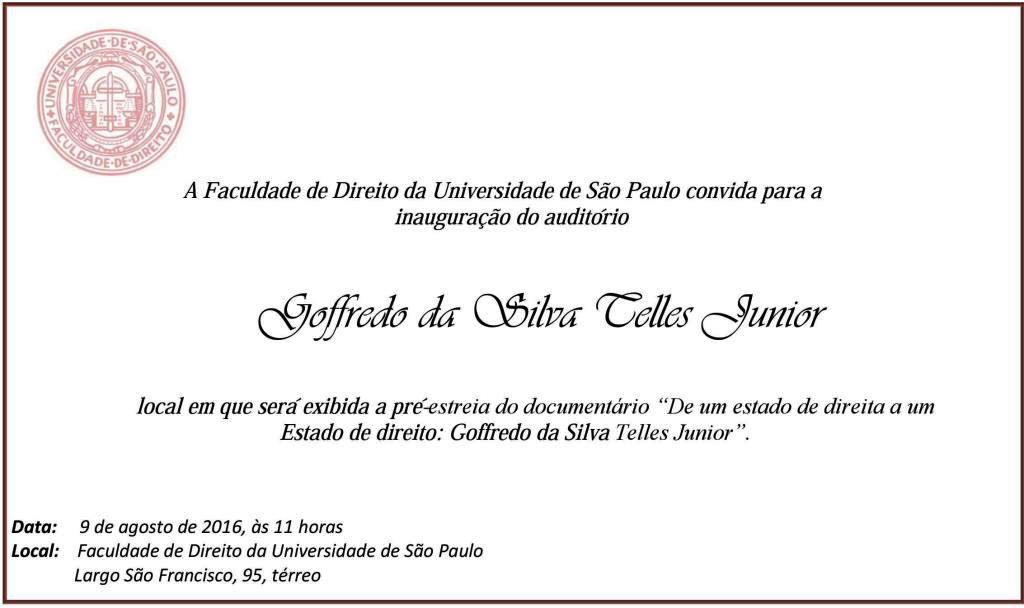 A Faculdade de Direito da USP convida para a inauguração do auditório Goffredo da Silva Telles Junior, dia 9/8, às 11h, local em que será exibida a pré-estreia do documentário "De um estado de direita a um Estado de direito : Goffredo da Silva Telles Junior". (Clique aqui)