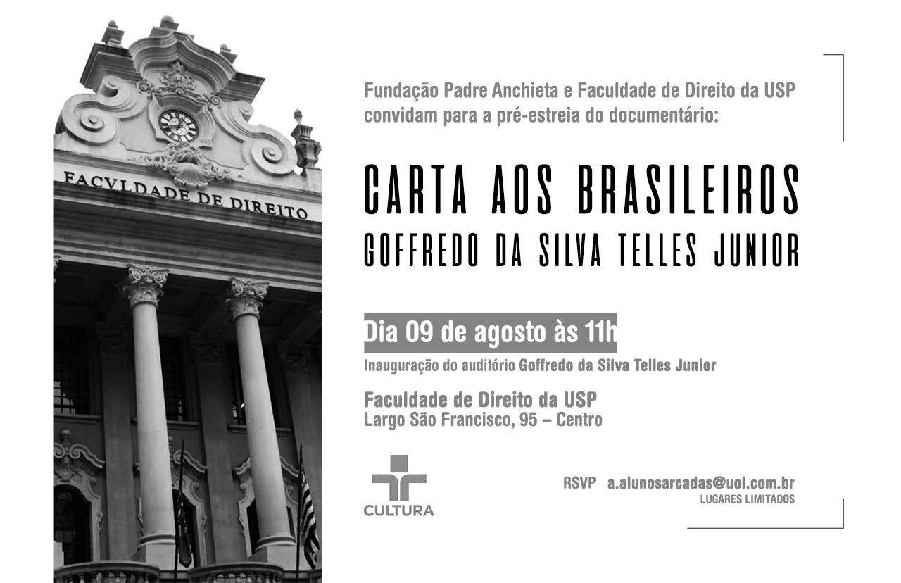 A Fundação Padre Anchieta e a Faculdade de Direito da USP convidam para a pré-estreia do documentário "Carta aos Brasileiros : Goffredo da Silva Telles Junior", dia 9/8, às 11h. As vagas são limitadas. (Clique aqui)