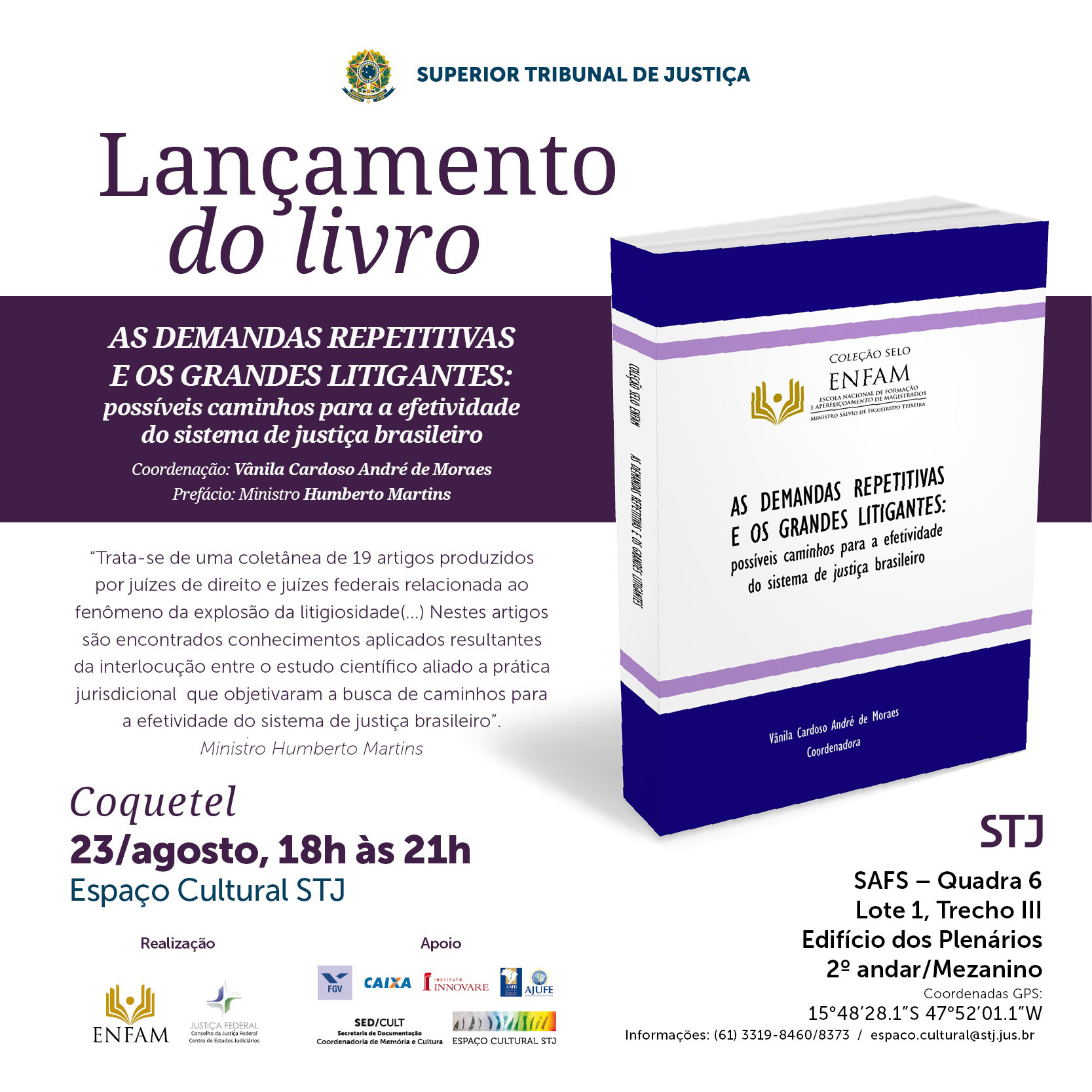 Acontece, no próximo dia 23, o lançamento da obra "As Demandas Repetitivas e os Grandes Litigantes : Possíveis Caminhos para a Efetividade do Sistema de Justiça Brasileiro", coordenada por Vânila Cardoso André de Moraes. O evento será em Brasília, no Espaço Cultural STJ, das 18 às 21h. (Clique aqui)