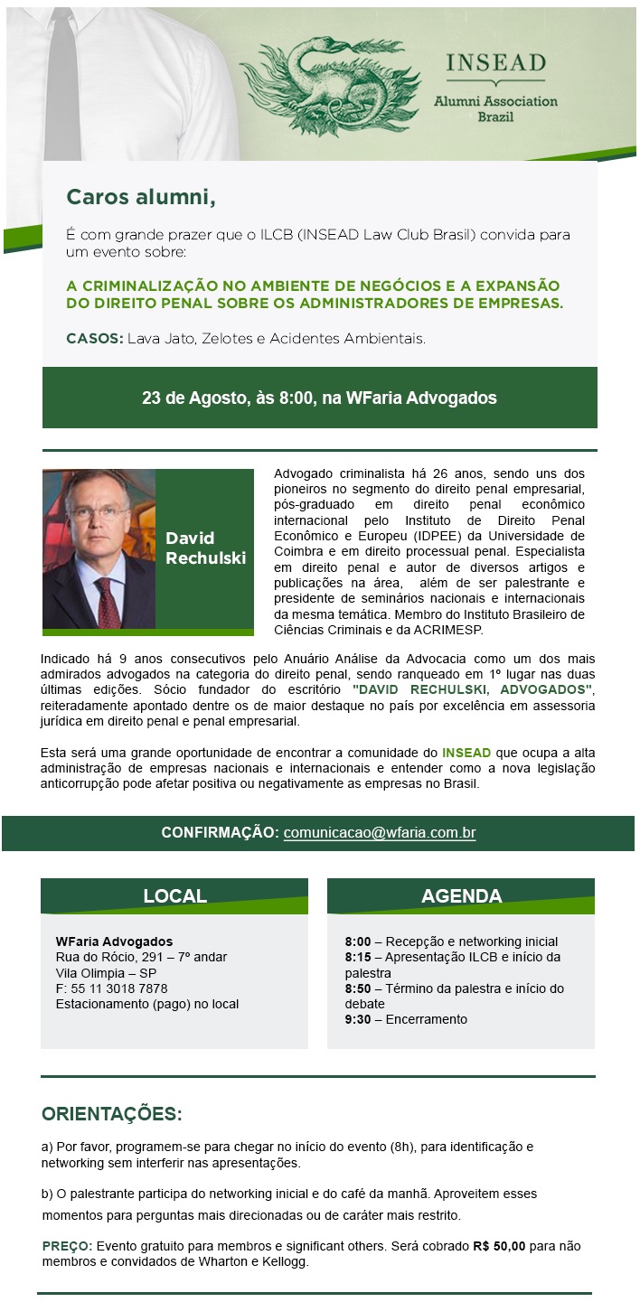 Amanhã, David Rechulski, da banca David Rechulski, Advogados, palestra durante o evento que terá como tema "A criminalização no ambiente de negócios e a expansão do Direito Penal sobre os administradores de empresas", às 8h, em SP. (Clique aqui)