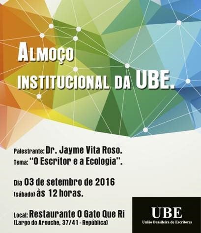 No dia 3/9, às 12h, em SP, Jayme Vita Roso, da Auditoria Jurídica, palestrará no Almoço Institucional da UBE, sobre o tema "O escritor e a Ecologia". (Clique aqui)