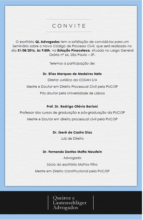 O escritório Queiroz e Lautenschläger Advogados promoveu ontem um seminário sobre "O Novo Código de Processo Civil", em SP. (Clique aqui)