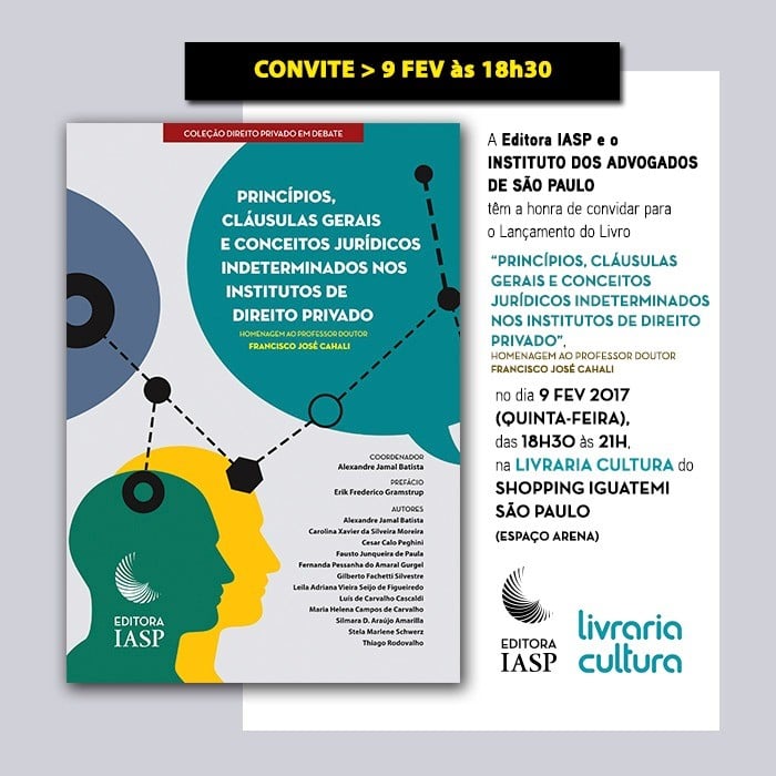 Acontece hoje o lançamento da obra coletiva "Princípios, Cláusulas Gerais e Conceitos Jurídicos Indeterminados nos Institutos de Direito Privado", coordenada por Alexandre Jamal Batista, da banca Ferriani e Jamal Sociedade de Advogados, uma homenagem ao professor Francisco José Cahali, e que tem a coautoria de Luis de Carvalho Cascaldi, do escritório Siqueira Castro Advogados. O evento será em SP, na Livraria Cultura do Shopping Iguatemi (av. Brigadeiro Faria Lima, 2.232), a partir das 18h30. (Clique aqui)