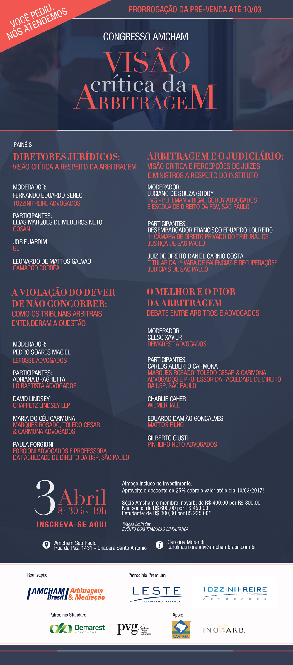 No dia 3/4, Elias Marques de Medeiros Neto, diretor jurídico da Cosan, participa do painel "Diretores jurídicos: visão crítica a respeito da arbitragem", durante o Congresso Amcham "Visão crítica da Arbitragem", que acontece das 8h30 às 19h, em SP. (Clique aqui)