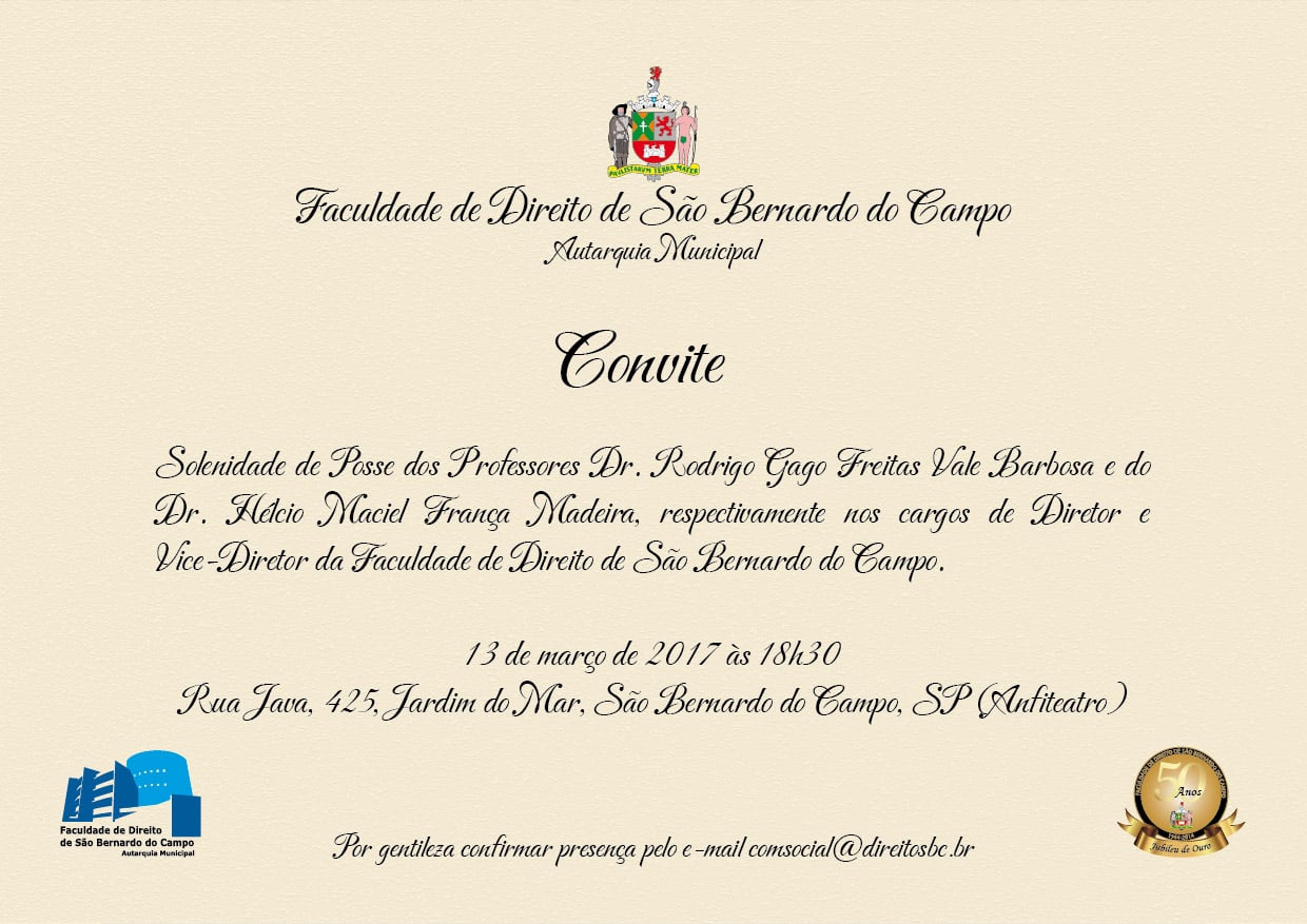 No dia 13/3, às 18h30, será realizada a cerimônia de posse da diretoria da Faculdade de Direito de São Bernardo do Campo gestão 2017/19. Tomam posse os professores Rodrigo Gago Freitas Vale Barbosa, como diretor, e Hélcio Maciel França Madeira, como vice-diretor da instituição. (Clique aqui)