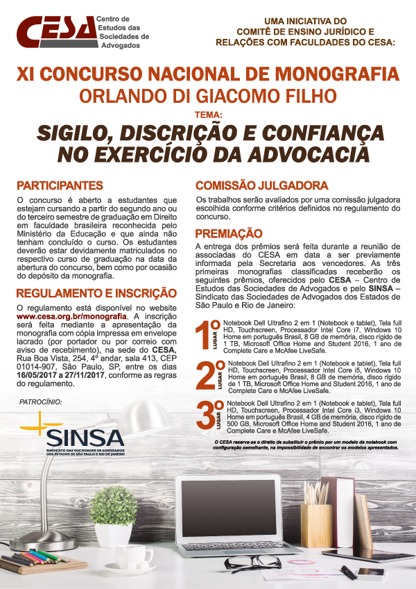 "Sigilo, Discrição e Confiança no Exercício da Advocacia" é o tema do "XI Concurso Nacional de Monografia - Orlando Di Giacomo Filho" (clique aqui), realizado por iniciativa do Comitê de Ensino Jurídico e Relações com Faculdades do CESA - Centro de Estudos das Sociedades de Advogados, coordenado pelos advogados Décio Policastro (Araújo e Policastro Advogados), Paulo Egídio Seabra Succar (Paulo Succar Advocacia Empresaria) e João Vestim Grande (Urbano Vitalino Advogados), dirigido a estudantes de Direito de Faculdades reconhecidas pelo MEC que estejam cursando à partir do segundo ano ou terceiro semestre do curso de graduação. O prazo das inscrições é de 16/5 a 27/11. Os três primeiros classificados ganharão notebooks de última geração patrocinados pelo CESA e SINSA - Sindicato das Sociedades de Advogados dos Estados de São Paulo e Rio de Janeiro e obras jurídicas. Todos os inscritos receberão certificados de participação. O regulamento do concurso com os detalhes sobre o formato de apresentação da monografia e os procedimentos para entregá-la podem ser conferidos, clicando aqui.
