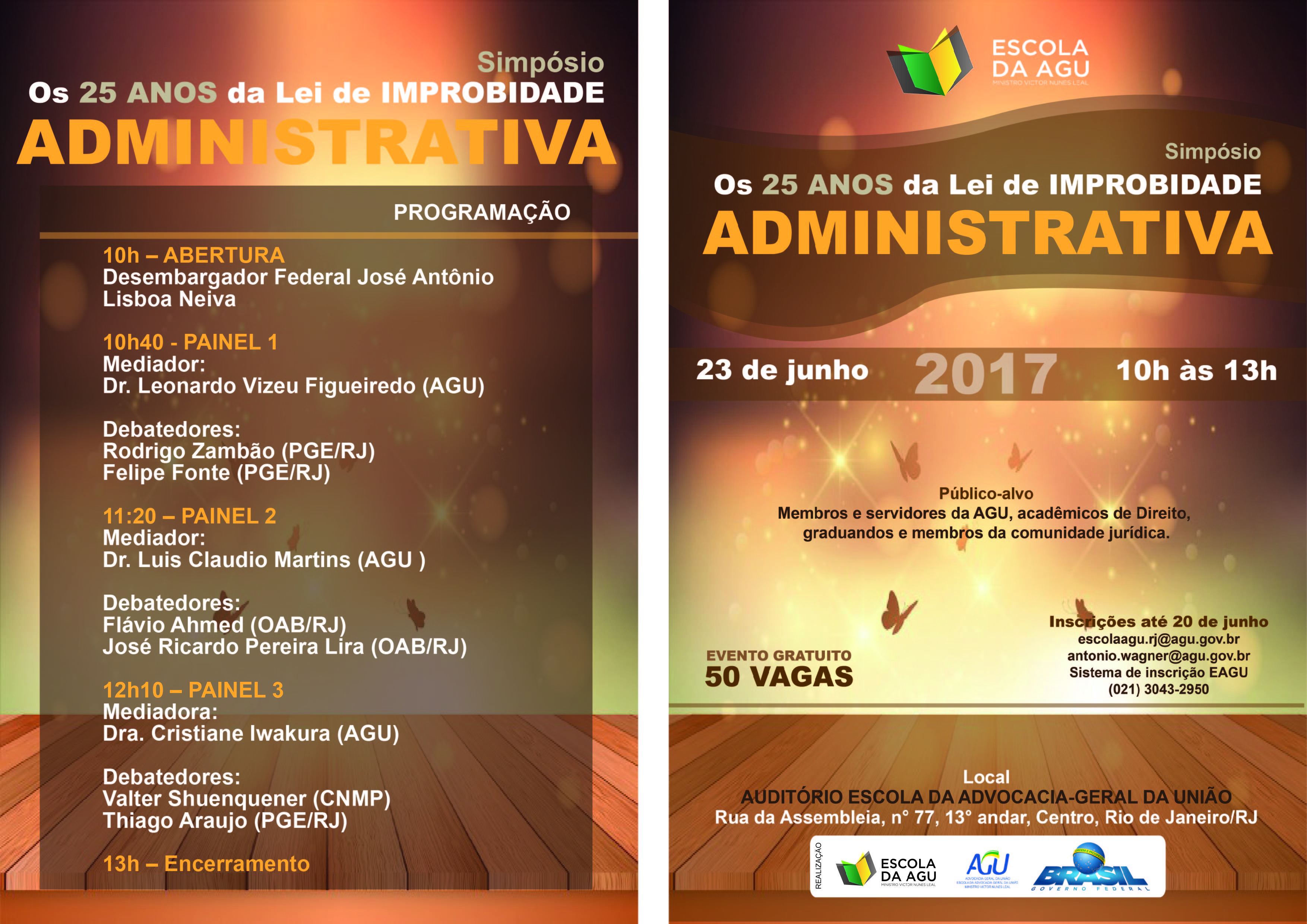 Amanhã, na Escola da AGU, no RJ, a partir das 10h, haverá o simpósio "Os 25 anos da Lei de Improbidade Administrativa". A conferência de abertura será proferida pelo desembargador Federal José Antônio Lisboa Neiva. A primeira mesa é composta pelos procuradores do Estado do RJ, Felipe Fonte, sócio do escritório Barroso Fontelles, Barcellos, Mendonça & Associados, e Rodrigo Zambão. A segunda mesa conta com os advogados José Ricardo Pereira Lira, sócio do Lobo & Ibeas Advogados, e Flavio Ahmed, consultor do escritório. (Clique aqui)