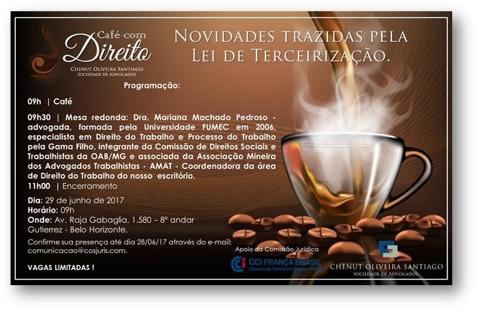 "Novidades trazidas pela Lei de Terceirização". Este é o tema da mesa redonda com a advogada Mariana Machado Pedroso, do escritório Chenut Oliveira Santiago Sociedade de Advogados. O encontro acontece no dia 29/6, às 9h, em BH/MG. (Clique aqui)