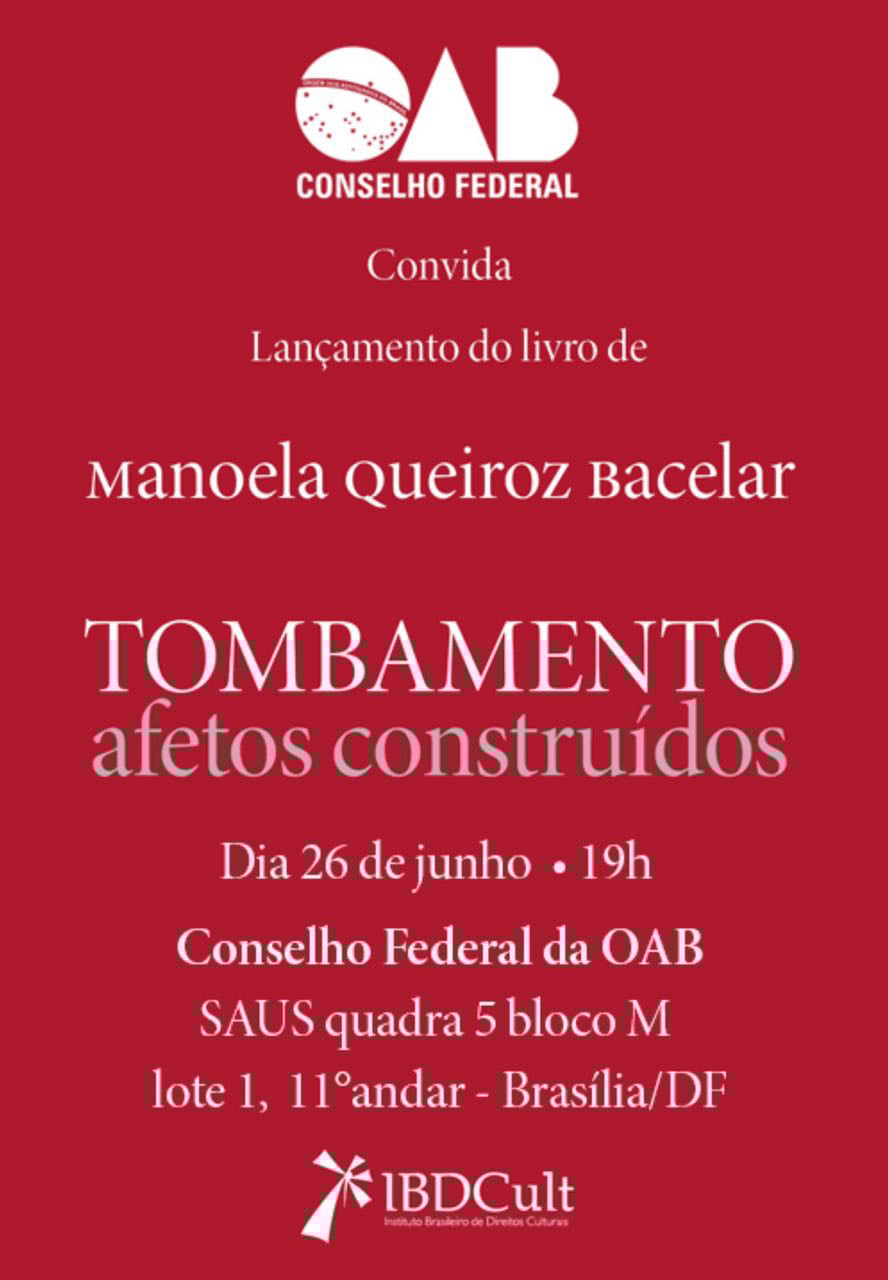 Acontece hoje o lançamento do livro "Tombamento - Afetos Construídos", de Manoela Queiroz Bacelar. O evento será em Brasília, no Conselho Federal da OAB, às 19h. (Clique aqui)