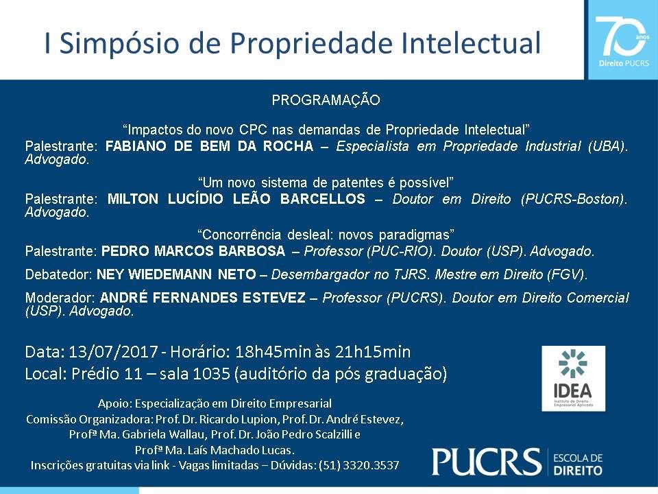 Amanhã, na PUC/RS, Pedro Marcos Nunes Barbosa, sócio do escritório Denis Borges Barbosa Advogados, apresenta palestra no "I Simpósio de Propriedade Intelectual" sobre "Concorrência desleal: novos paradigmas". (Clique aqui)