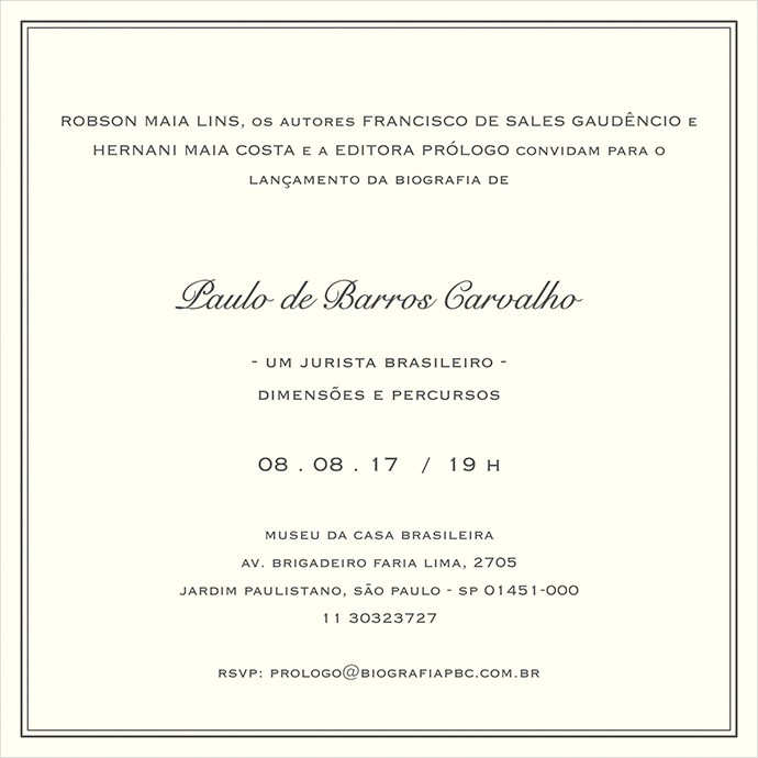 Acontece, no próximo dia 8, o lançamento da biografia "Paulo de Barros Carvalho - Um Jurista Brasileiro - Dimensões e Percursos" (Prólogo), de Robson Maia Lins, Francisco de Sales Gaudêncio e Hernani Maia Costa. O evento será em SP, no Museu da Casa Brasileira, às 19h. (Clique aqui)