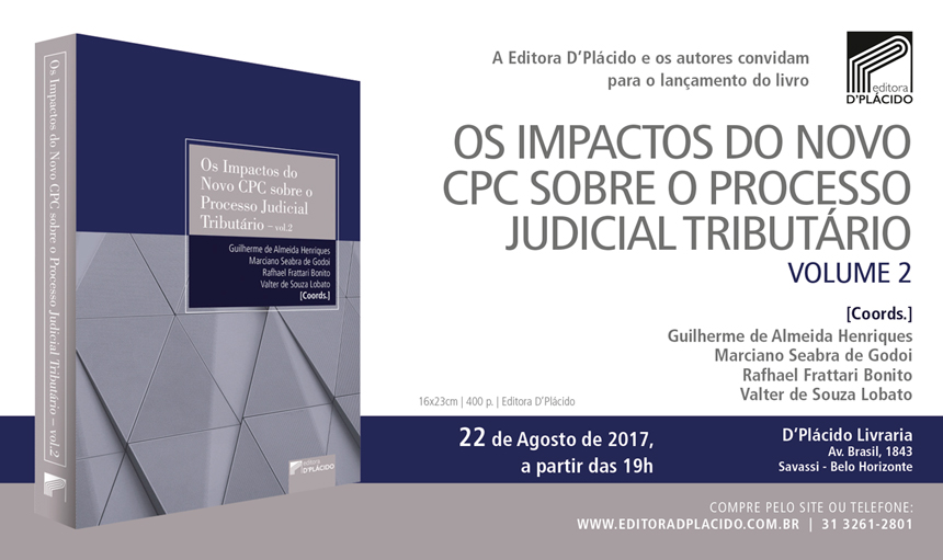 Acontece, no próximo dia 22, o lançamento do volume II do título "Os Impactos do Novo CPC no Processo Judicial Tributário" (D'Plácido), coordenado por Guilherme de Almeida Henriques, Marciano Seabra de Godoi, Rafhael Frattari Bonito e Valter de Souza Lobato, sócio do escritório Sacha Calmon - Misabel Derzi Consultores e Advogados. O evento será em BH, na Livraria D'Plácido, a partir das 19h. (Clique aqui)