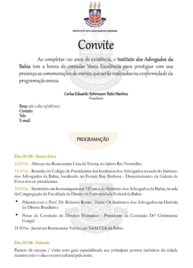 O Instituto dos Advogados da Bahia comemora 120 anos de fundação no dia 18/8. O evento contará com a presença de Antônio Mário Pinto, do escritório Albuquerque Pinto Advogados e presidente do Instituto dos Advogados de Pernambuco - IAP. Edmundo Guimarães, Murilo Mattos e Alexandre Bullos, sócios do escritório, também participam da comemoração. (Clique aqui)