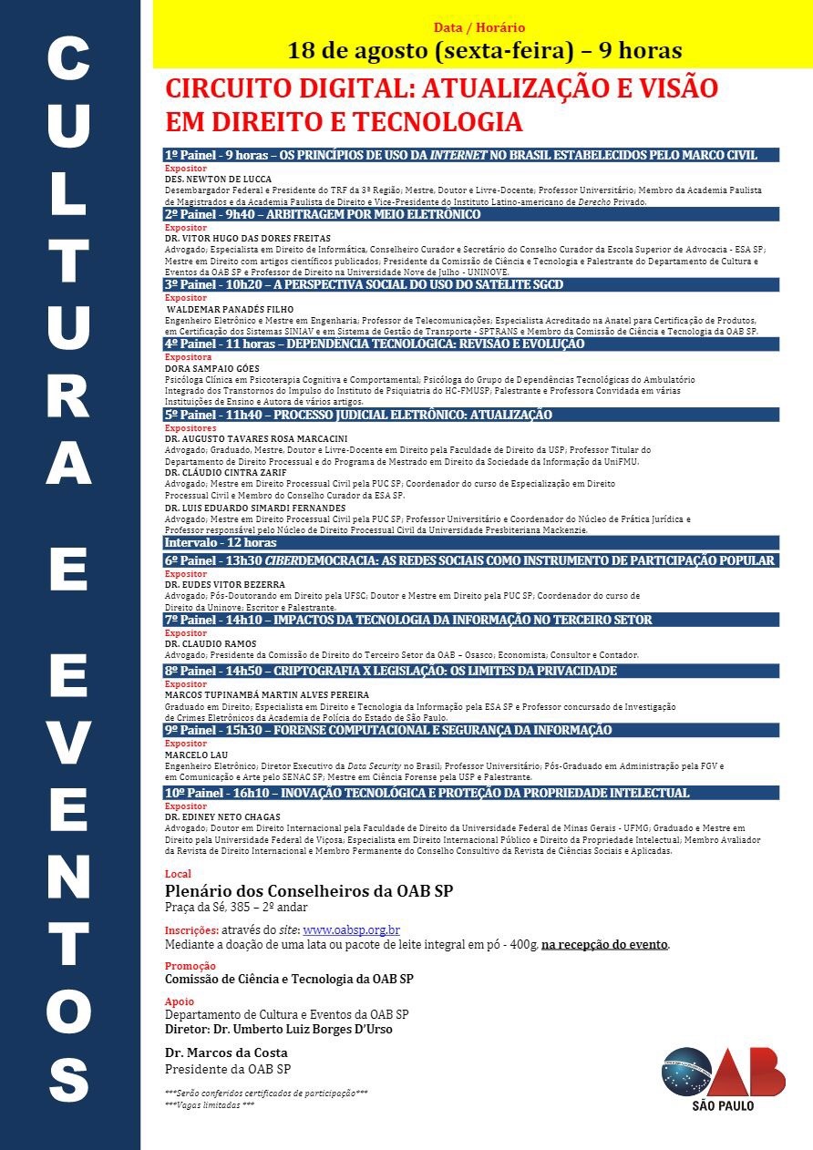 Hoje, o professor Cláudio Cintra Zarif, coordenador do curso de especialização em Direito Processual Civil, membro do Conselho Curador da ESA/SP e do escritório Zarif e Nonaka Advogados, participa do painel "Processo Judicial Eletrônico: Atualização", que integra o evento "Circuito Digital: Atualização e Visão em Direito e Tecnologia", no plenário dos conselheiros da OAB/SP. (Clique aqui)