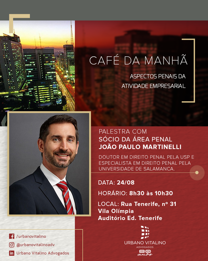 O escritório Urbano Vitalino Advogados realiza hoje, em SP, o "Café da Manhã - Aspectos Penais da Atividade Empresarial", com palestra do sócio da área penal João Paulo Martinelli. (Clique aqui)