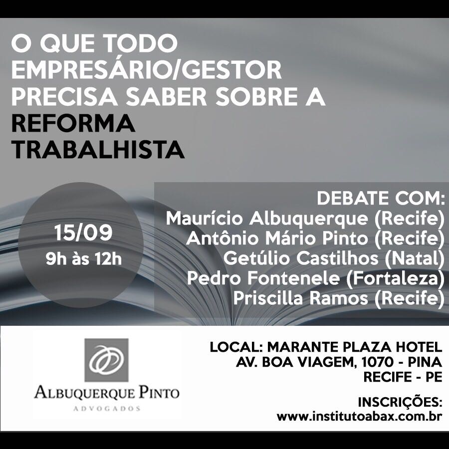 Em Recife/PE, dia 15/9, Albuquerque Pinto Advogados realiza o evento "O que todo empresário/gestor precisa saber sobre a Reforma Trabalhista". Maurício Albuquerque, Antônio Mário Pinto, Getúlio Castilhos, Pedro Fontenele e Priscilla Ramos são os debatedores do encontro. (Clique aqui)