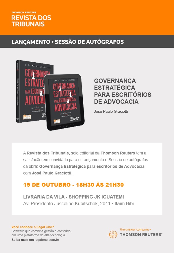 Acontece, amanhã, o lançamento do livro "Governança Estratégica para Escritórios de Advocacia", de José Paulo Graciotti. O evento será em SP, na Livraria da Vila do Shopping JK Iguatemi, das 18h30 às 21h30. (Clique aqui)
