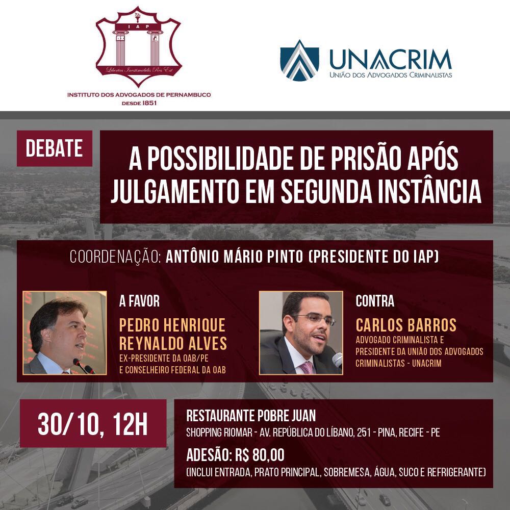 Em Recife, dia 30/10, acontece o debate "A Possibilidade de Prisão após Julgamento em Segunda Instância", realizado pelo IAP em parceria com a Unacrim. Sócio do Albuquerque Pinto Advogados, Antonio Mário de Abreu Pinto, presidente do IAP, coordena o debate. (Clique aqui)