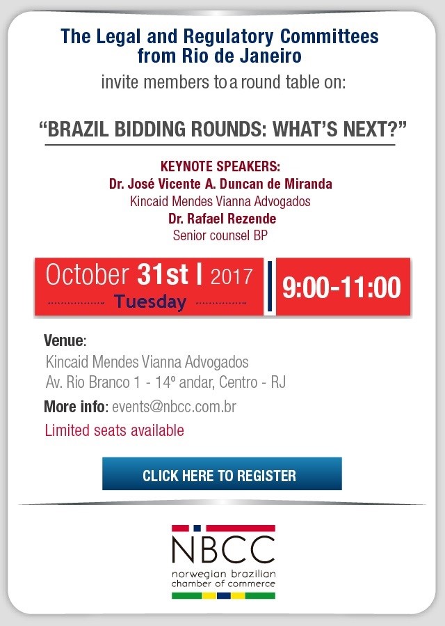 Dia 31/10, das 9 às 11h, no RJ, o escritório Kincaid | Mendes Vianna Advogados recebe os membros do "Comitê Legal e Regulatório da Câmara de Comercio Noruega-Brasil (NBCC)" para o evento "Brazil Bidding Rounds: What's Next?". O advogado José Vicente A. Duncan de Miranda, novo "head" da área de Óleo e Gás da banca, será um dos principais palestrantes. (Clique aqui)