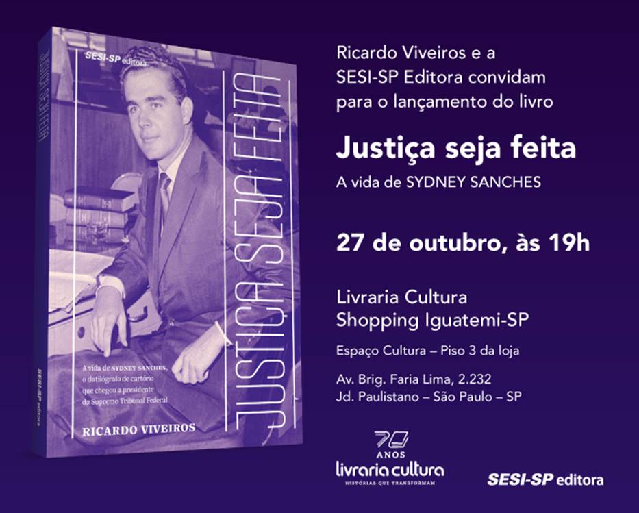 Acontece, no próximo dia 27, o lançamento da obra "Justiça seja feita - A Vida de Sydney Sanches", de Ricardo Viveiros. O evento será em SP, na Livraria Cultura do Shopping Iguatemi (av. Brig. Faria Lima, 2.232p.), às 19h. (Clique aqui)
