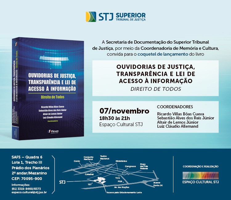 Acontece, no próximo dia 7, o lançamento da obra "Ouvidorias de Justiça, Transparência e Lei de Acesso à Informação: Direito de Todos", coordenada por: ministro Ricardo Villas Bôas Cueva, ministro Sebastião Alves dos Reis Júnior, desembargador Altair de Lemos Júnior e conselheiro do CNJ Luiz Cláudio Allemand. O evento será em Brasília, no Espaço Cultural STJ, das 18h30 às 21h. (Clique aqui)