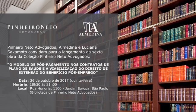 No próximo dia 26, a Editora Almedina Brasil lança o título "O Modelo de Pós-Pagamento nos Contratos de Plano de Saúde e a Viabilização do Direito de Extensão do benefício Pós-Emprego", de Luciana Sakamoto, do escritório Pinheiro Neto Advogados. O evento será em SP, na biblioteca da banca, das 18h30 às 21h. (Clique aqui)