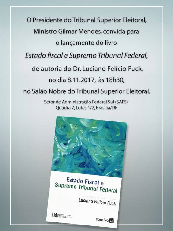 No próximo dia 8, a Editora Saraiva lança o título "Estado Fiscal e Supremo Tribunal Federal", do secretário-Geral da presidência do TSE, Luciano Felício Fuck. O evento será em Brasília, no Salão Nobre do TSE, às 18h30. (Clique aqui)