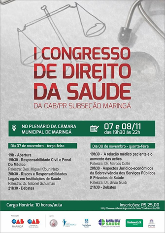 Gabriel Schulman, consultor de Denis Borges Barbosa Advogados, apresenta a palestra "Riscos e Responsabilidades Legais em Instituições de Saúde" hoje, às 20h30, na OAB/PR - Seção Maringá, no "I Congresso de Direito da Saúde". (Clique aqui)
