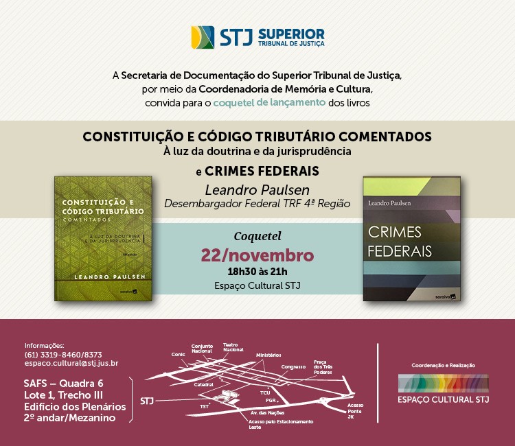 Acontece, no próximo dia 22, o lançamento dos livros "Constituição e Código Tributário Comentados" e "Crimes Federais", do desembargador Federal Leandro Paulsen. O evento será em Brasília, no Espaço Cultural STJ, das 18h30 às 21h. (Clique aqui)
