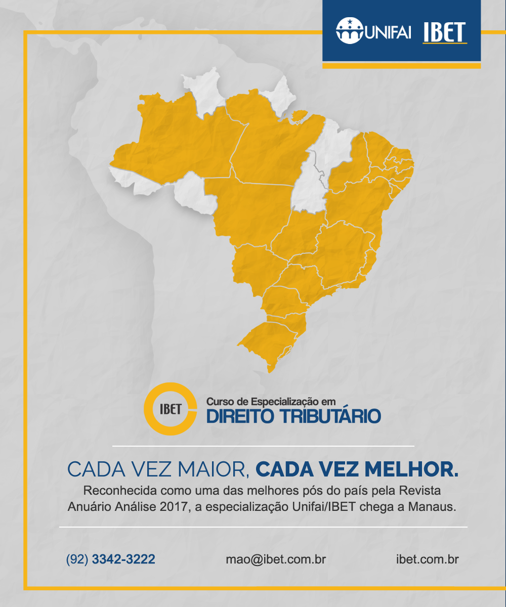 O Instituto Brasileiro de Estudos Tributários - IBET está com uma nova unidade em Manaus (clique aqui). Coordenação de Jean Cleuter Simões Mendonça. Informações podem ser obtidas por e-mail. (Clique aqui)