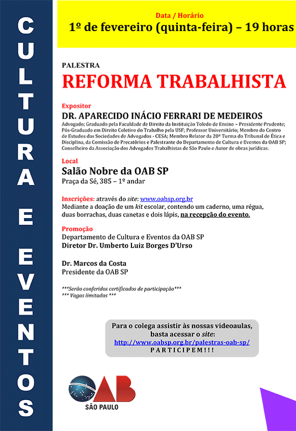 No dia 26 de fevereiro, Migalhas promove o evento "Polêmicas e Debates sobre a Reforma Trabalhista", no Hotel Tivoli São Paulo - Mofarrej, em SP. Nomes de peso vão tratar dos diversos aspectos da reforma. Não perca esta oportunidade de se atualizar, inscreva-se já. As vagas são limitadas. (Clique aqui)