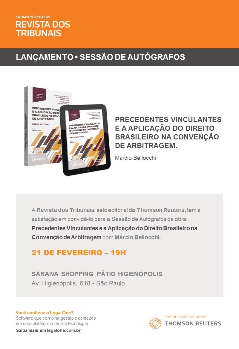 Será lançado, no próximo dia 21, o livro "Precedentes Vinculantes e a Aplicação do Direito Brasileiro na Convenção de Arbitragem" (Thomson Reuters - Revista dos Tribunais), de Márcio Bellocchi. O evento será em SP, na Livraria Saraiva do Shopping Pátio Higienópolis, às 19h. (Clique aqui)
