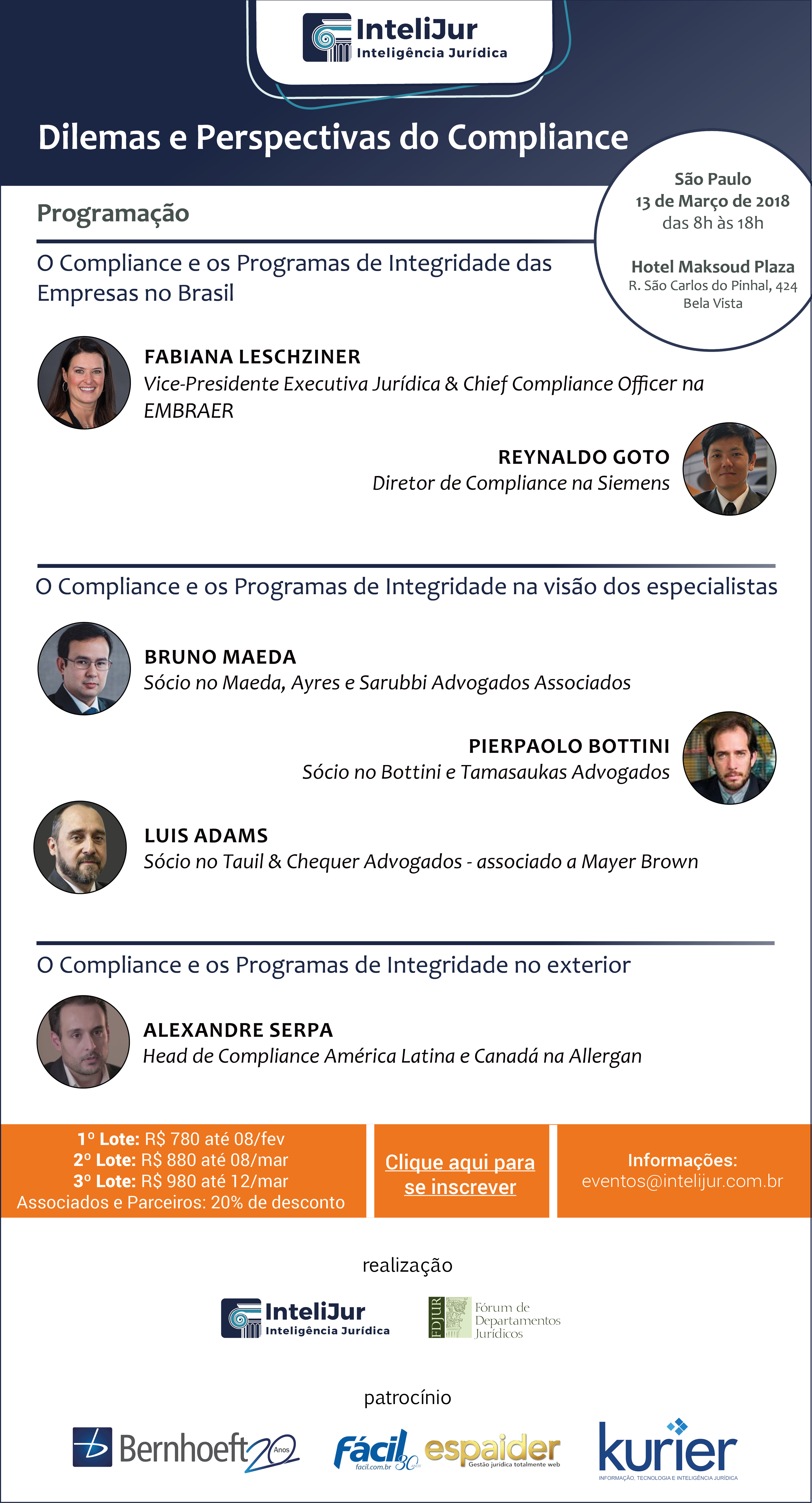 Hoje, em SP, Pierpaolo Cruz Bottini, da banca Bottini & Tamasauskas Advogados, participa do seminário "Dilemas e Perspectivas do Compliance", abordando o tema "O Compliance e os Programas de Integridade na visão dos especialistas". (Clique aqui)