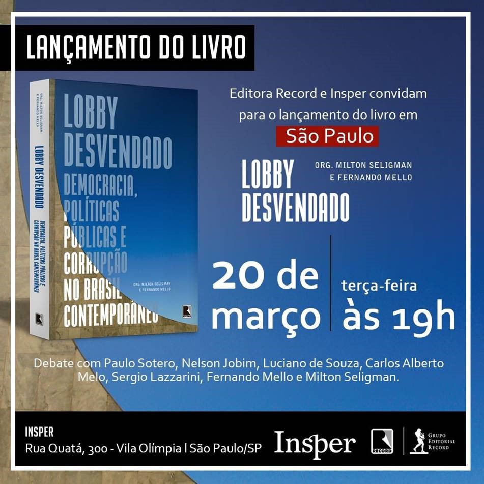 Acontece, no próximo dia 20, o lançamento do título "Lobby Desvendado - Democracia, Políticas Públicas e Corrupção no Brasil Contemporâneo" (Record), organizado por Milton Seligman e Fernando Mello. O evento será em SP, no Insper, às 19h. (Clique aqui)