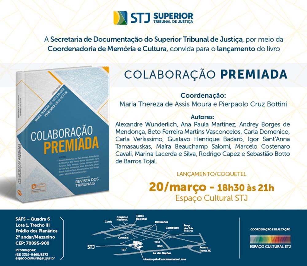 No próximo dia 20, ocorre o lançamento do livro "Colaboração Premiada" (Thomson Reuters - Revista dos Tribunais), coordenado por Pierpaolo Cruz Bottini, do escritório Bottini & Tamasauskas Advogados, e pela ministra Maria Thereza de Assis Moura, do STJ. O evento será em Brasília, no Espaço Cultural STJ, das 18h30 às 21h. (Clique aqui)