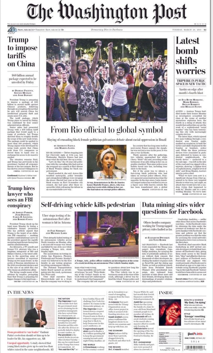 A capa do "The Washington Post" falando de Marielle Franco: "From Rio official to global symbol". (Clique aqui)