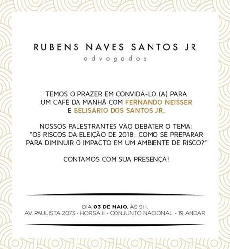 "Os riscos da Eleição de 2018: como se preparar para diminuir o impacto em um ambiente de risco?". Este é o tema de um café da manhã que reúne os juristas Fernando Neisser e Belisário dos Santos Jr., dia 3/5, às 9h, na sede do escritório Rubens Naves Santos Jr. Advogados, em SP. (Clique aqui)